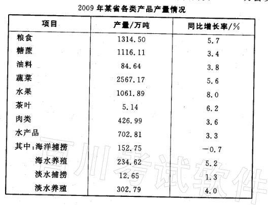问题 2009年,某省全年粮食作物播种面积253. 85万公顷,比上年增长1. 5%;糖蔗种植面积13. 58万公顷,下降0. 2%;油料种植面积33.14万公顷,增长2. 3%;蔬菜种植面积113. 84万公顷,增长2. 3%。 能够从上述资料中推出的是( )。 A.与上年相比,2009年肉类的增产量高于水产品的增产量 B. 2008年,肉类和水产品总产量高于粮食产量 C. 2009年,茶叶种植面积比上年有所增长 D. 2009年,水产品捕捞业产量比上年有所下降