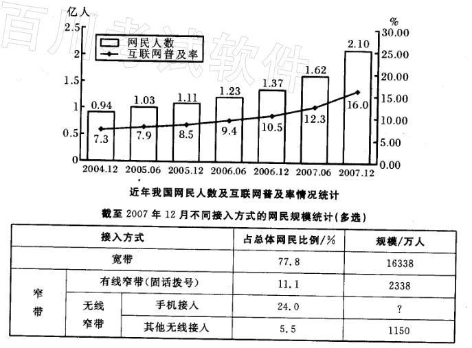 解析 2007年12月,我国网民人数为2. 1亿人;2004年年底,我国网民人数为0.94亿人,则截至2007年12月,我国网民人数增长了(2.1 -0.94)/0.94X100%≈123.40%。