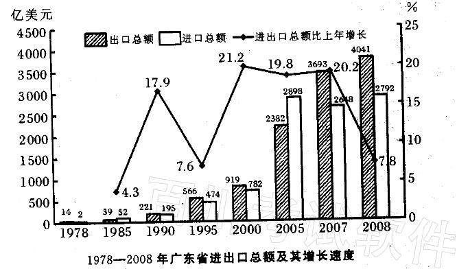 解析 2008年珠三角九市进口额占全省进口总额的2696.1/2791. 6X100%≈96.6%。出口额占全省出口总额的3871. 2 /4041X100%≈95.8%。