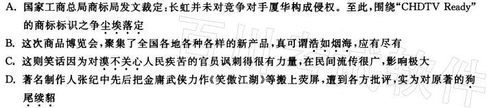 解析 A项“尘埃落定”指事情终于有了结果。B项“浩如烟海”形容典籍、图书等极为半富,不能用来形容商品。C项“漠不关心”态度冷淡,毫不关心,不能带宾语,要说成“对……漠不关心”。D项“狗尾续貂”指拿不好的东西补接在好的东西后头,不适用于“改编”文学作品。