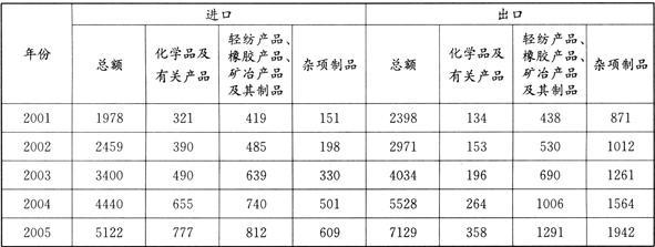 (二)材料一:2001-2005年中国制成品进出口货物分类表(单位:亿美元)资料来源:《中国统计年鉴——2006》,北京,中国统计出版社,2006...