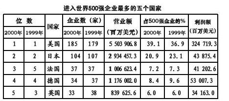 解析 观察营业额这一列,对五个国家进入世界500强的企业营业额对号入座,进行比较排序。
