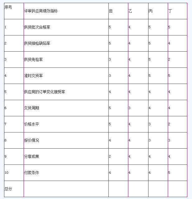 某商品流通企业经销的某种商品原有甲、乙、丙、丁四个供应商供货。经过一年的时间,该企业对四个供应商的绩效进行评审,评审绩效的指标为l0项,各供应商每项指标的...