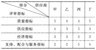 问题 共用题干 某商品流通企业经销的某种商品有甲、乙、丙、丁四个供应商可供选择。该企业依据有关标准确定了评审供应商绩效的指标体系。每项指标分为5个档次:好、较好、一般、较差、极差。每个档次的分值分别为:好,5分;较好,4分;一般,3分;较差,2分;极差,1分。根据四个供应商前两年的供货情况,依据供应商绩效评审指标体系给每个供应商打分,具体得分如下表所示: