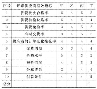 问题 共用题干 某商品流通企业经销的某种商品原有甲、乙、丙、丁四个供应商供货。经过一年的时间,该企业对四个供应商的绩效进行评审,评审绩效的指标为10项,各供应商每项指标的得分情况如下表: