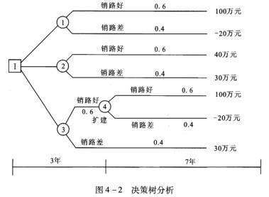 问题 某企业为生产一种新产品,提出了三种方案:甲方案是投资290万元建大厂,乙方案是投资120万元建小厂。丙方案是先建小厂,若销路好3年后再进行扩建,投资160万元;扩建后有效期7年,所得收益与建大厂相同。三种方案的使用期均为10年,所面临的自然状态、概率和条件如表4-2所示。