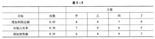 问题 某商品流通企业在制定年度生产经营计划时,有增加利润总额、提高市场占有率和增加销售额三个目标。为实现这三个目标,拟定了甲、乙、丙、丁四种方,每种方案对各项目标的价值各不相同。各项目标的权数和各方案对各项目标的预计价值得分(十分)如表5-5所示。用价值分析法选择出的比较满意的方案是()。