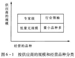 解析 按供应商的规模和经营品种进行供应商细分,一般以供应商的规模作为纵坐标,经营品种作为横坐标进行矩阵分析,如图6-1所示。