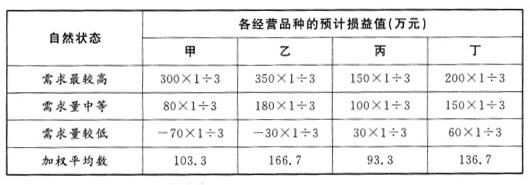 共用题干 某商场在开业前要选择经营商品的种类,现有甲、乙、丙、丁四类商品可供选择。由于对未来市场需求无法做到比较精确的预测,只能大致估计为:需求量较高、...