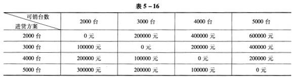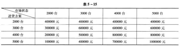 问题 共用题干 年初某家电商场决定新增电冰箱销售业务,据市场调查资料显示:作为同行企业的10家商场去年的销售状况基本上处于2000台、3000台、4000台的水平上,最高的达到5000台。通常每销售一台电冰箱平均可获利200元,而每积压一台电冰箱则损失100元。据此,给出预期获利表如表5-15所示。