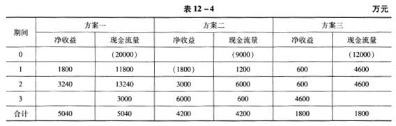 问题 共用题干 某企业在进行项目投资决策时,有三项投资方案可供选择,各方案在其寿命周期内的净利润和现金净流量如表12-4所示。设贴现率为10%,回答下列问题: