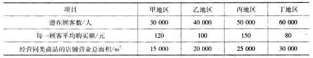 问题 共用题干 某零售商计划从四个备选地区中选择一个合适的地区开设一家零售商店,每个地区购买某类商品的潜在顾客数(C)、每一顾客平均购买额(RE)、经营同类商品的店铺营业总面积(RF)等数据信息如下表所示。一旦零售商选择了合适的地区后,将着手在该地区进行店铺选址。根据以上资料,回答下列问题: