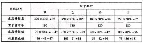 某商场在开业前要选择经营商业的种类,现有甲、乙、丙、丁四类商品可供选择。由于对未来市场需求无法做到比较精确的预测,只能大致估计为:需求量较高、需求量中等、...