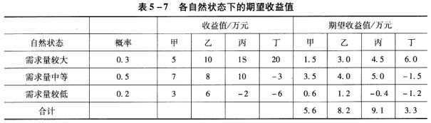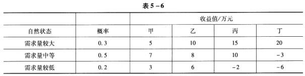 解析 期望收益值=∑(收益值*概率)。根据已知条件可求得各自然状态下的期望收益值,如表5-7所示。 甲方案的期望值=5*0.3+7*0.5+3*0.2=5.6;乙方案的期望值=10*0.3+8*0.5+6*0.2=8.2;丙方案的期望值=15*0.3+10*0.5+(-2)*0.2=9.1;丁方案的期望值=20*0.3+(-3)*0.5+(-6)*0.2=3.3。丙方案的期望收益值比其他三个方案都大,因此,比较满意的方案是丙方案。