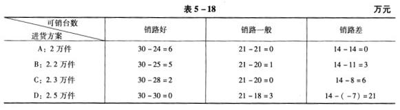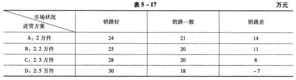 解析 从表5-17可以看出,A方案中的最小收益额为14万元;B方案中的最小收益额为11万元;C方案中的最小收益额为8万元;D方案中的最小收益额为(-7)万元。A方案中的最小收益额最大,根据悲观准则“小中取大”,应选择的进货方案是A,即进货2万件。 根据公式:折中损益值=a*最大损益值+(1-a)*最小损益值。A方案的折中损益值=0.7*24+0.3*14=21(万元);B方案的折中损益值=0.7*25+0.3*11=20.8(万元);C方案的折中损益值=0.7*28+0.3*8=22(万元);D方案的折中损益值=0.7*30+0.3*(-7)=18.9(万元)。根据折中准则,选择折中损益值最大的方案作为比较满意的方案。所以,应选择折中损益值最大的C方案,即进货2.3万件。 各方案的后悔值如表5-18所示。A方案的最大后悔值为6万元;B方案的最大后悔值为5万元;C方案的最大后悔值为6万元;D方案的最大后悔值为21万元。其中B方案的后悔值5万元最小。因此,若运用后悔值准则,B方案为比较满意的方案,即选择进货2.2万件。 期望收益值=∑(收益值*概率)。A方案的期望收益值为:0.3*24+0.4*21+0.3*14=19.8(万元);B方案的期望收益值为:0.3*25+0.4*20+0.3*11=18.8(万元);C方案的期望收益值为:0.3*28+0.4*20+0.3*8=18.8(万元);D方案的期望收益值为:0.3*30+0.4*18+0.3*(-7)=14.1(万元)。可见,A方案的期望收益值最大,应选择进货2万件。
