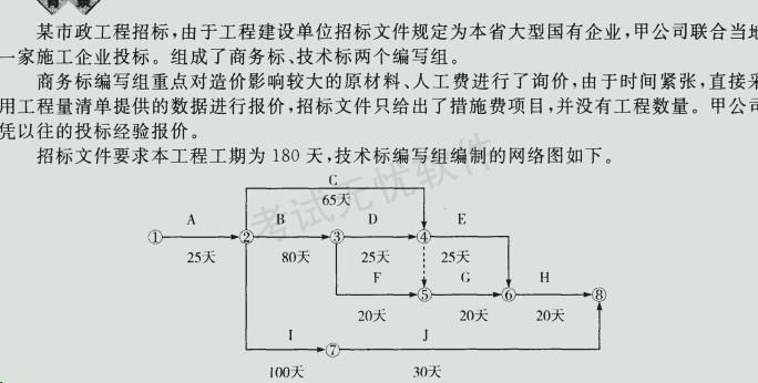 解析 1.建设单位对投标单位的限定不合法。 公开招标应该平等地对待所有的投标人,不允许对不同的投标人提出不同的要求。《中华人民共和国招标投标法》规定,招标人不得以不合理的条件限制或者排斥潜在投标人,不得对潜在投标人实行歧视待遇。 2.商务标编制存在的不妥当之处及改正措施如下述。 (1)不妥当之处:只对原材料、人工费进行了询价。 改正:还应对机械设备的租赁价、分部分项工程的分包价等进行询价。 (2)不妥当之处:按照招标文件给定的分部分项工程量清单进行投标报价。 改正:应该根据招标文件中提供的相关说明和图纸,重新校对工程量,重新确定报价。 (3)不妥当之处:措施费按照以往的投标经验进行报价。 改正:应该根据企业自身特点和工程实际情况,结合施工组织设计对招标人所列的措施项目做适当增减。 3.技术标编写组绘出的网络计划图工期为175d。 关键线路为A、B、D、E、H。 工期满足招标文件要求。 4.最终的技术标还应补充得内容:①编制施工组织设计;②选择施工方案和工艺,确定技术、质量、安全文明施工和环境保护等方面措施;③应依据企业所提供的资源,确定现场临时设施及环境保护、文明安全施工、材料二次搬运等方案;④应依据工程进度,编制各种资源需求计划;⑤制定交通导行方案和现场平面布置图。