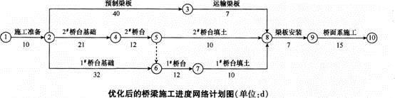A公司承建城市道路改扩建工程,其中新建一座单跨简支桥梁,节点工期为90d,项目部编制了网络进度计划,如图1所示(单位:d)。公司技术负责人在审核中发现该施...