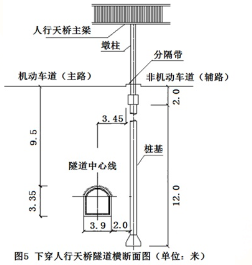 某公司承建城区防洪排涝应急管道工程,受环境条件限制,其中一段管道位于城市主干路机动车道下,垂直穿越现状人行天桥,采用浅埋暗挖隧道形式;隧道开挖断面3.9×...