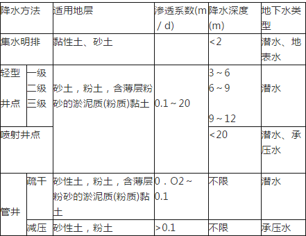 解析 考点:井点降水方法的选用。井点降水方法的选用见表2: 井点降水方法的选用表2