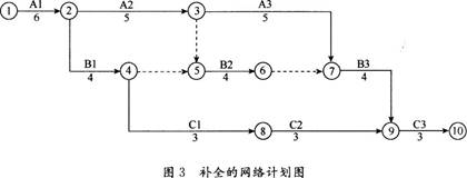 解析 1.补全的网络计划图如图3所示: 2.修改的网络计划图如图4所示: 3.关键线路:①→②→③→⑦→⑨→⑩,工期为:6+5+5+4+3=23d。 4.A3工作(设备事故)延误的工期不能索赔。 理由:施工单位原因造成的,且A3工作在关键线路上。
