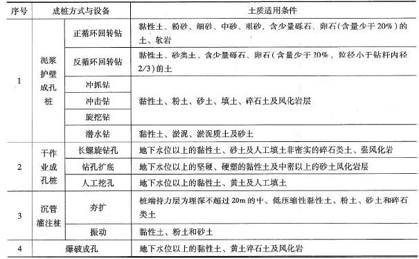 解析 }钻孔灌注桩施工,依据成桩方式可分为泥浆护壁成孔、干作业成孔、沉管成孔桩及爆破成孔,施工机具类型及土质适用条件可参考表。