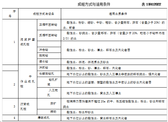 解析 钻孔灌注桩施工,依据成桩方式可分为泥浆护壁成孔、干作业成孔、沉管成孔桩及爆破成孔, 施工机具类型及土质适用条件可参考表。