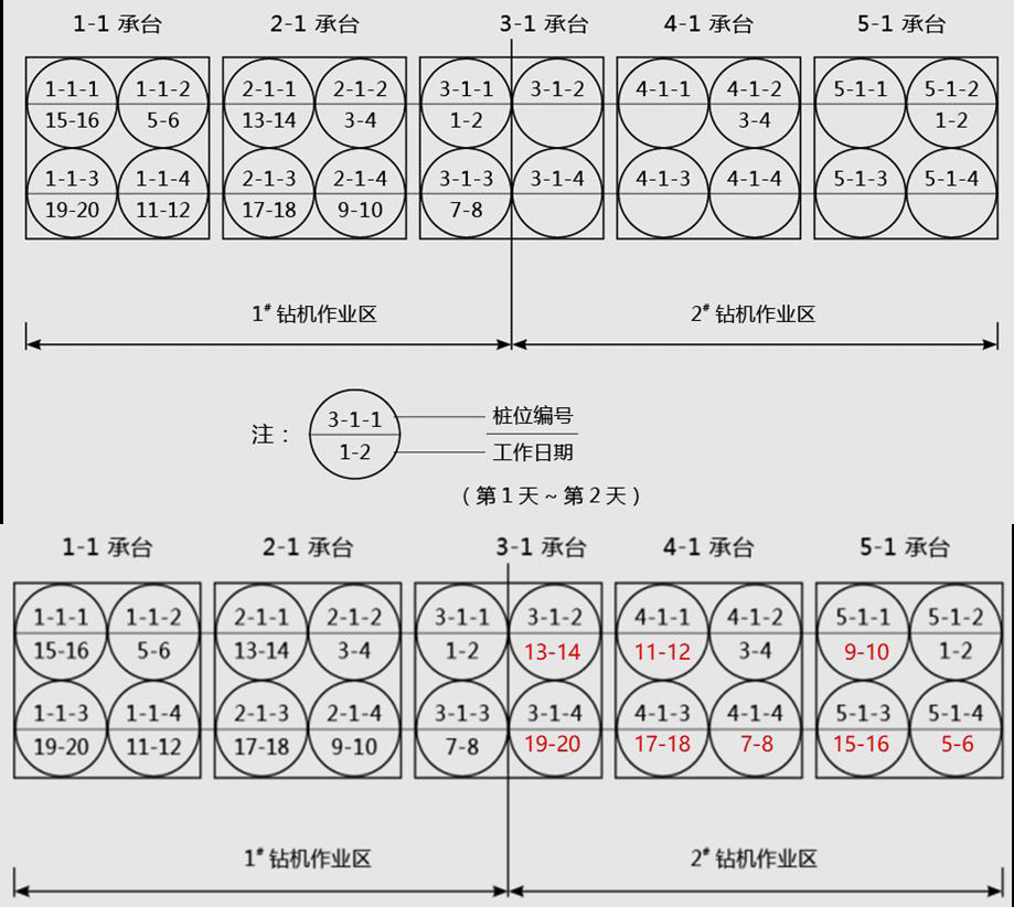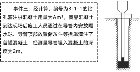 问题 某公司项目部施工的桥梁基础工程,灌注桩混凝土强度为 C25 直径 1200mm,桩长 18m承台、桥台的位置如图所示 4-1 所示,承台的桩位编号如图 4-2 所示。 事件一:项目部依据工程地质条件,安排 4 台反循环钻机同时作业,钻机工作效率(1根桩/2d)。在前 12 天,完成了桥台的 24 根桩,后 20 天要完成 10 个承台的 40 根桩。承台施工前项目部对 4 台钻机作业划分了区域,见图 4-3。并提出要求:1. 每台钻机完成 10 根桩 2. 一座承台只能安排 1 台钻机作业,3. 同一承台两桩施工间隙为 2 天。 1#钻机工作进度安排及 2#钻机部分工作进度安排如图 4-3 所示 事件二:项目部对已加工好的钢筋笼做了相应标识,并且设置了桩顶定位吊环连接筋,钻机成孔、清孔后,监理工程师验收合格,立即组织吊车吊放钢筋笼和导管,导管底部距孔底 0.5m。 事件三:经计算,编号为 3-1-1 的钻孔灌注桩混凝土用量为 Am3,商品混凝土到达现场后施工人员通过在导管内安放隔水球、导管顶部放置储灰斗等措施灌注了首罐混凝土,经测量导管埋入混凝土的深度为 2m。 图 4-4 1#钻机、2#钻机工作进度安排示意图 【问题】 1. 事件一中补全 2#钻机工作区作业计划,用图 4-4 的形式表示。(将此图复制到答题卡上,在试卷上答题无效) 2. 钢筋笼标识应有哪些内容? 3. 事件二中吊放钢筋笼入口时桩顶高程定位连接筋长度如何确定,用计算公式(文字)表示。 4. 按照灌注桩施工技术要求,事件三中 A 值&首罐混凝土最小用量各为多少? 5. 混凝土灌注桩前项目部质检员对到达现场商品混凝土应做哪些工作?