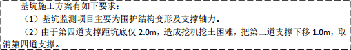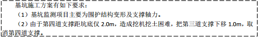 解析 1. 围挡应采用硬质材料,围绕施工现场连续无缺口设置;高度不应低于 2.5m。 2. 不妥当。 理由:相关法律法规规定,项目负责人对施工安全全面负责。 3. 还需补充:焊接(切割)工、司炉工、爆破工、机械操作工、起重工、塔吊司机及指挥人员、电梯司机等。 【解析】特殊工种:电工、焊工、架子工、司炉工、爆破工、机械操作工、起重工、塔吊司机及指挥人员、人货两用电梯司机等)。 电焊架炉爆,机操吊信号 4. 补充的监测项目:① 围护结构水平及垂直位移;② 支撑变形;③ 地下水位;④ 土体水平位移;⑤ 地表沉降;⑥ 周围建筑物沉降及倾斜;⑦ 地下管线沉降;⑧ 地表、建筑物、支护结构裂缝;⑨ 临近道路沉降。 5. 不妥之处:第三道支撑下移 1.0m,取消第四道支撑。 这种做法可能造成墙体变形过大,甚至导致围护支撑体系失稳造成基坑坍塌。