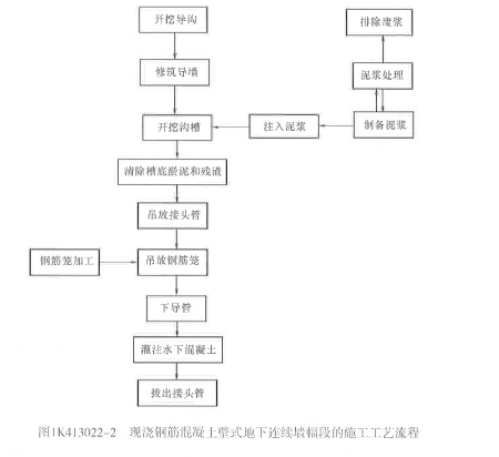 解析 教材P125 图1K413022-2现浇混凝土壁式地下连续墙的施工工艺流程:开挖导沟—修筑导墙—开挖沟槽—清除槽底淤泥和残渣—吊放接头管—吊放钢筋笼—下导管—灌注水下混凝土—拔出接头管。