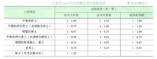 解析 教材P201 (三)(1)当地质条件良好、土质均匀、地下水位低于沟槽底面高程,且开挖深度在5m以内、沟槽不设支撑时,沟槽边坡最陡坡度应符合表1K415012-2的规定。
