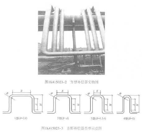解析 教材P223 (2)方形补偿器:方形补偿器(如图1K415023-2和图1K415023-3所示,由管子弯制或由弯头组焊而成,利用刚性较小的回折管挠性变形来消除热应力及补偿两端直管部分的热伸长量。其优点是制造方便,补偿量大,轴向推力小,维修方便,运行可靠;缺点是占地面积较大。填料式补偿器(套筒式补偿器):安装方便,占地面积小,流体阻力较小,抗失稳性好,补偿能力较大。