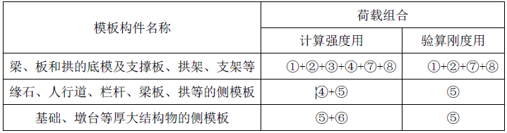 解析 设计模版、支架和拱架时应按下表进行荷载组合。 注:表中代号意思如下: ①模板、拱架和支架自重; ②新混凝土浇筑、钢筋混凝土或砌体的自重力; ③施工人员及施工材料机具等行走运输或堆放的荷载; ④振捣混泥土时的荷载; ⑤新浇筑混泥土对侧面模板的压力; ⑥倾倒混泥土时产生的水平向冲击荷载; ⑦设于水中的支架所承受的水流压力、波浪力、溜冰压力、船只及其他漂浮物的撞击力; ⑧其他可能产生的荷载,如风雪荷载、冬期施工保温设施荷载等。