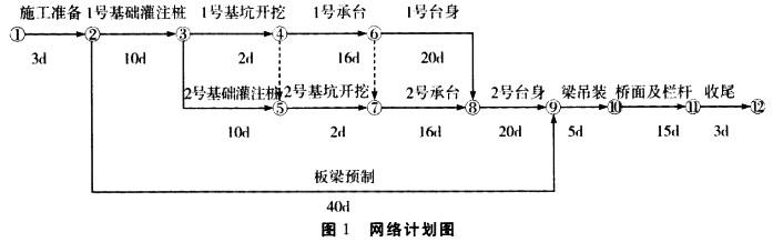 某市政跨河桥上部结构为长13m单跨简支预制板梁,下部结构由灌注桩基础、承台和台身构成。施工单位按合同工期编制了网络计划如图1,经监理工程师批准后实施。