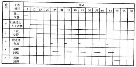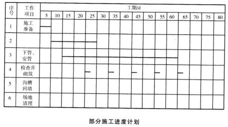 考虑管材进场的连续性和人力资源的合理安排,在编制进度计划时作了以下部署:(1)挖土5d后开始进行下管、安管工作。(2)下管、安管200m后砌筑检查井。(3)检查井砌筑后,按四个并段为一组(200m)对沟槽回填。项目部编制的施工进度计划如下图所示(只给出部分内容)。