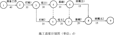 解析 1.计划总工期:170d。 本网络计划的关键工作是:准备工作、打桩1、挖土1、基础1、基础2、回填土2(①→②→③→④→⑥→⑦→⑧→⑨)。 2.事件一:工期不可索赔;费用不可索赔。 原因:施工方法不当导致,是施工单位责任。 事件二:费用可索赔2万元;工期不可赔偿。 原因:事件发生是由于勘察报告不正确,属建设单位责任。挖土2不在关键线路上,作业时间延长时间没有超过总时差,没能影响总工期。 3.隐蔽工程隐蔽前,施工单位应通知监理单位检查验收,未经监理工程师签字(同意或确认),施工单位不得进行下一道工序施工,监理工程师有权要求施工单位挖开回填土检查。