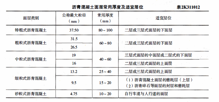 解析 教材P3页 表2k311012.砂粒式沥青混凝土适宜自行车道与人行道面层。特粗式沥青混凝土和粗式沥青混凝土适宜二层或三层式面层的下面层。