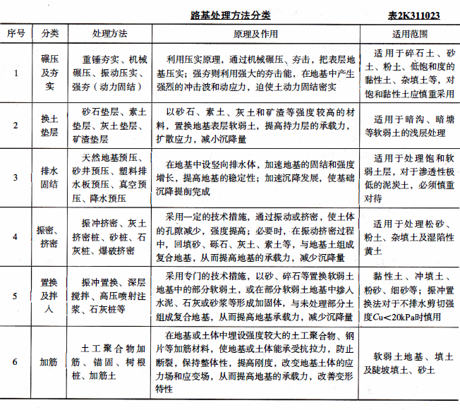 解析 教材P15页 路基处理的方法路基处理的方法,根据其作用和原理大致分为六类,如表2K311023所示。换土垫层适用于暗沟、暗塘等软弱土的浅层处理故淤泥应换填。