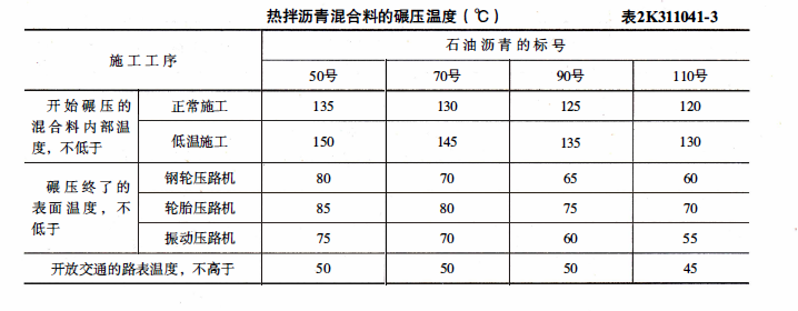 解析 教材P21页 表2K311041-3,热拌沥青混凝土混合料碾压开始内部温度随沥青标号而定,正常施工取值范围为120-135℃。