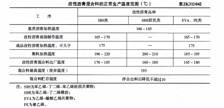 解析 教材P23页 表2K311042,改性沥青混合料的正常生产范围,工序改性沥青混合料出厂温度为170~185℃
