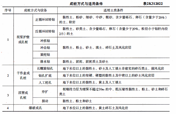 解析 教材P58页 表2k312022,长螺旋钻孔适用于地下水位以上的黏性土、砂土及人工填土非密实的碎石类土、强风化岩。旋挖钻、冲抓钻、冲击钻适用粘性土、粉土、砂土、填土、碎石土、及风化岩。