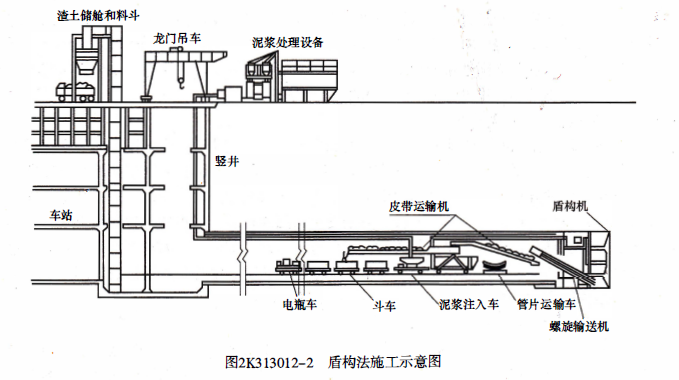 解析 教材P79-80页 盾构法施工示意图见图2K313012-2所示,其基本施工步骤: (1)在盾构法隧道的始发端和接收端各建一个工作(竖)井。 (2)盾构在始发端工作井内安装就位。 (3)依靠盾构千斤顶推力(作用在已拼装好的衬砌环和工作井后壁上)将盾构从始发工作井的墙壁开孔处推出。 (4)盾构在地层中沿着设计轴线推进,在推进的同时不断出土和安装衬砌管片。 (5)及时地向衬砌背后的空隙注浆,防止地层移动和固定衬砌环位置。 (6)盾构进人接受工作井并被拆除,如施工需要,也可穿越工作井再向前推进。
