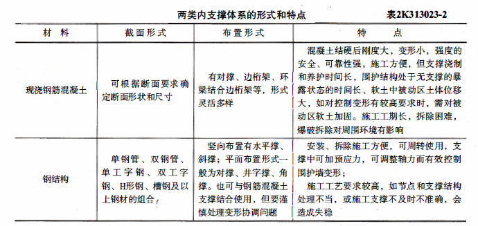 解析 教材P101页 表2K313023-2两类内支撑体系的形式和特点中的内容。原文是钢结构布置形式平面布置形式一般分为对撑、井字撑、角撑,也有与钢筋混凝土支撑结合使用的情况。