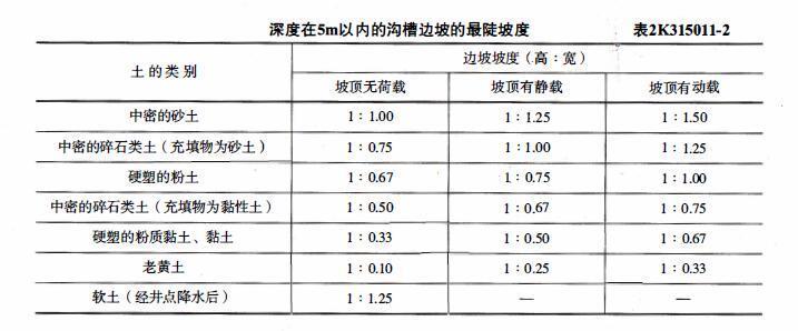 解析 教材P137页 表2K315011-2中三列不同条件下,选取每一列的相同条件时,可见C项的硬塑粘土的坡比值均最大,因此可采用的边坡也是最陡的。