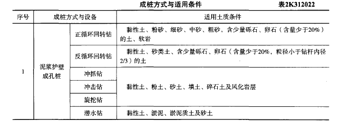 解析 新教材P57页 表2k312022,长螺旋钻孔适用于地下水位以上的黏性土、砂土及人工填土非密实的碎石类土、强风化岩。旋挖钻、冲抓钻、冲击钻适用粘性土、粉土、砂土、填土、碎石土、及风化岩。