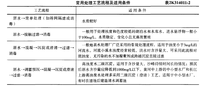 解析 新教材P119页 表2K314011-2,原水→混凝、沉淀或澄清→过滤→消毒→出水,一般地表水处理厂广泛采用的常规处理流程,适用于浊度小于3mg/L的河流水。