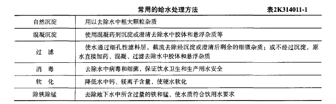 解析 新教材P118 给水与污水处理工艺流程。见本页表2K314011-1可知:常用的给水处理工艺方法有:自然沉淀→混凝沉淀→过滤→消毒→软化→除铁除锰。