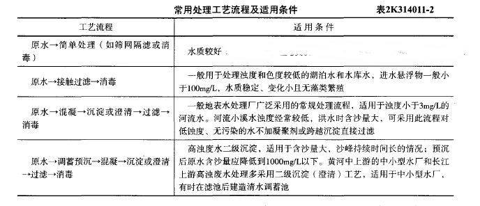 解析 新教材P119页 表2K314011-2中内容一般地表水处理厂广泛采用的工艺流程为:原水→混凝沉淀或澄清→过滤→消毒。