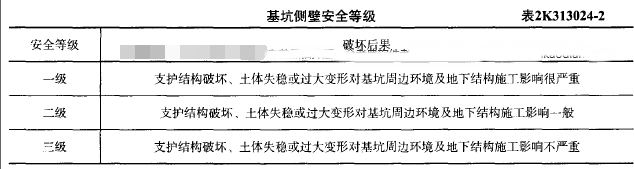 解析 新教材P104 基坑侧壁安全等级表2K313024-2:一级支护:结构破坏、土体失稳或过大变形对基坑周边环境及地下结构施工影响很严重;二级,一般;三级,不严重。