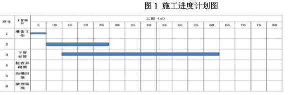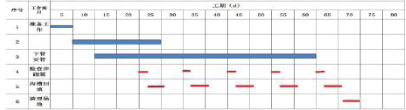 问题 某项目部承建的雨水管道工程管线总长为1000m,采用直径为900mm 的HDPE 管,柔性接口;每50m设检查井一座。管底位于地表下以下4m,无地下水,土质为湿陷性黄土和粉砂土,采用挖掘机开槽施工。项目部根据建设单位对工期的要求编制了施工进度计划。编制计划时,项目部使用的指标见表1。 考虑管材进场的连续性和人力资源的合理安排,在编制进度计划时作了以下部署:①挖土5d 后开始进行下管、安管工作;②下管、安管200m 后砌筑检查井;③检查井砌筑后,按四个井段为一组(200m)对沟槽回填。 项目部编制的施工进度计划如图1 所示(只给出部分内容)。 工程开工30 天后遇雨,停工10 天。项目部决定在下管、安管工序采取措施,确保按原计划工期完成,并启动雨季应急预案。 问题 1. 施工进度计划图中序号2 表示什么工作项目?该项目的起止日期和工作时间应为多少? 2. 计算沟槽回填的工作的总天数。 3. 按项目部使用的指标和工作部署,完成施工进度计划图中第4、5、6 项工作的横道线,并指出计划总工期需要多少天。 4. 遇雨后项目部应在下管、安管工序采取哪些措施以确保按原计划工期完成? 5. 本工程雨季施工的应急预案应包括哪些内容? 6. 请写出本工程的施工顺序。
