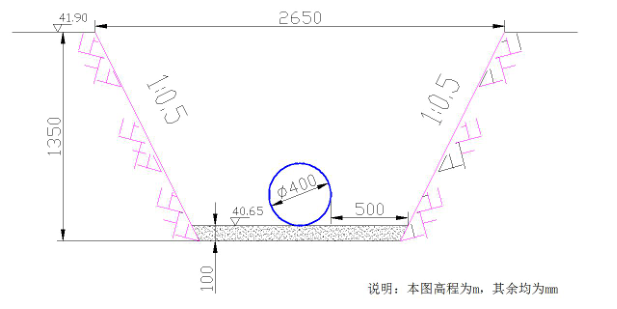 问题 某市政道路及综合管线工程,道路由南向北,起点里程桩号为K0+150m,终点里程桩号为K2+950m。设计红线宽30m,其中,主路宽16m,无中央隔离带,主路与两侧人行道 之间设绿化隔离带2m,人行步道宽5m;沿道路下拟建管线有雨水、污水,中水和燃气,拟建管线位置如下:距道路中线左侧3m 和5m 分别为拟建雨水和污水管线,距道路中线右侧2m 和7m 为拟建中水和燃气管线。 项目部在开工前进行图纸会审工作,其中对道路里程桩号K1+150m 的道路及管线标高核对如下,道路设计高程42.35m,污水流水面设计高程39.47m,雨水流水面设计高程为40.36m,中水、燃气管道管外底设计标高分别为40.65m 和41.15m;本工程中水、燃气管道管材均为外径φ400mm 的PE 管,管道基础为100mm 中粗砂。采用热熔连接,要求管道安装工作面净宽为0.5mm,在施工中控制材料自身温度与环境温度相接近,并要求热熔连接的参数符合规定要求。 根据本工程的土质决定,沟槽挖深在1.2 m 以内采用直槽无支护开挖,开挖深度超过1.2m 采用1:0.5 的坡度放坡开挖。 道路结构层(沥青混凝土面层和基层)厚度为450mm;拟建道路穿越农田,地势平坦,现况地面标高比设计道路路面标高平均低150mm,经监理工程师同意,决定在施工前对红线范围内的地面进行清表至路中路床顶标高后在进行管线施工。清除地表土方工程量经监理现场进行确认。 问题: 1.根据案例背景描述,画出道路K1+150m 位置道路及管线横断面图。 2.根据本案例背景描述,画出K1+150m 处中水管道施工横断面图。 3.PE 管道热熔连接的参数包括哪些? 4.列式计算本工程主路部分需要清表多少方土。 5.项目部在开工前进行图纸会审的目的是什么